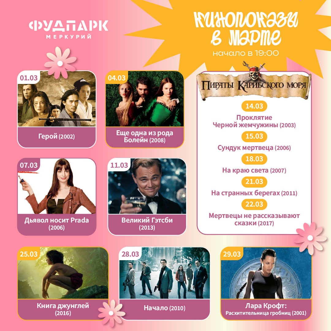 Друзья! Весна в ФудПарке Меркурий начинается с большого кино. Весь март мы будем показывать для вас любимые фильмы — от приключенческих саг до культовых драм. Приходите смотреть хорошее кино в уютной атмосфере нашего фуд парка!